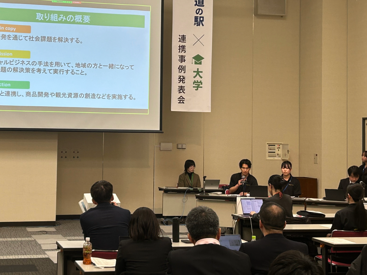 3月6日に国土交通省北海道開発局が主催する「道の駅×大学連携事例発表会」が開催されました。今年は全国13の道の駅と大学が登壇し、本学からは「道の駅いちかわ」との連携について、人間社会学部勅使河原隆行教授とゼミナール生が発表を行いました。